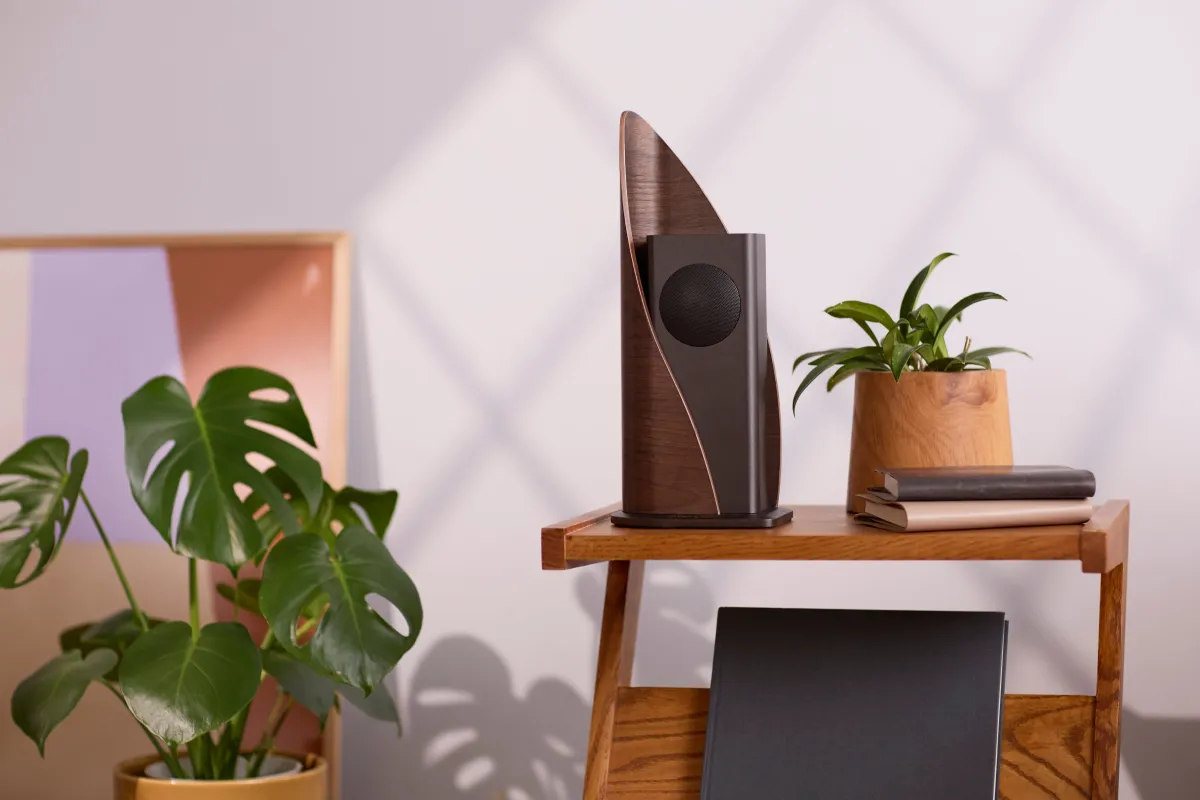 オークとウォルナットを使用した優雅なデザインの「Sail」は、Bluetoothスピーカーとしての機能に加え、間接照明としても活用できます。その独特なフォルムは、インテリアに自然に溶け込み、空間に心地よいリズムを提供します。