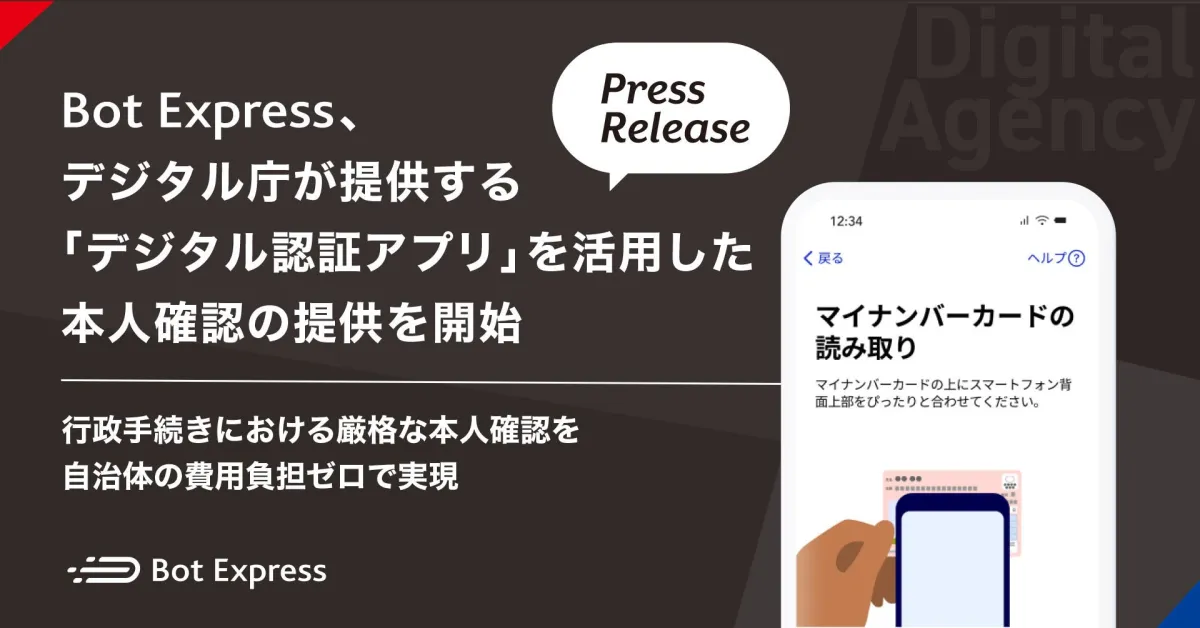 株式会社Bot Expressは、デジタル庁が提供する「デジタル認証アプリ」を活用し、スムーズかつ安全な本人確認のプロセスを提供しています。このアプリにより、自治体は本人確認を無料で実施できるようになり、住民は手続きをより簡便に行えるようになります。