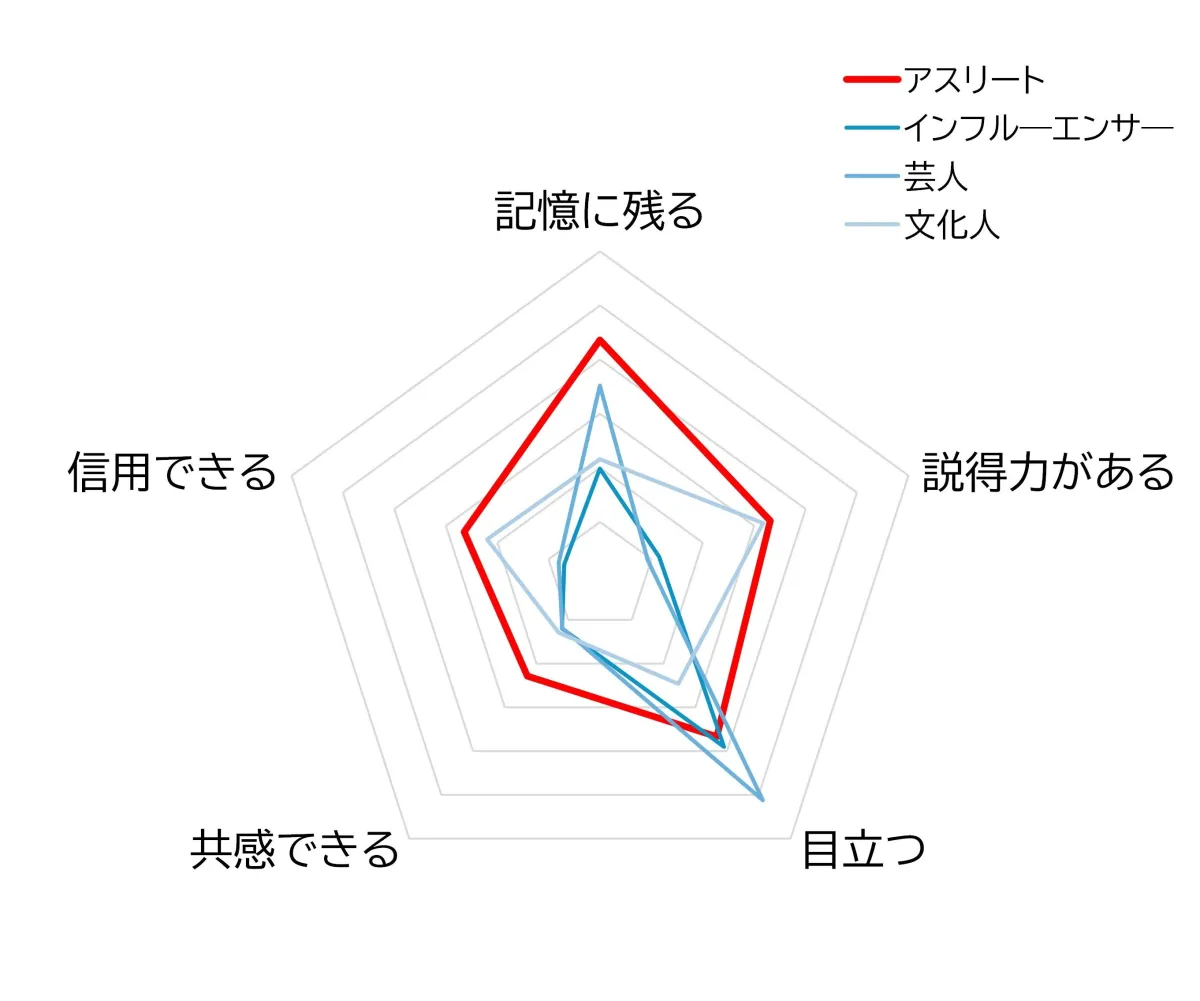 調査結果では、アスリートが出演するCMに対する印象が非常に高いことが示されています。多くの指標で、アスリートの印象は最高値を記録しました。特に「記憶に残る」「説得力がある」「信用できる」「共感できる」という評価は、アスリート出演のCMが最も高い結果を出しました。このことから、視聴者はアスリートに対してポジティブな印象を持っていることがわかります。