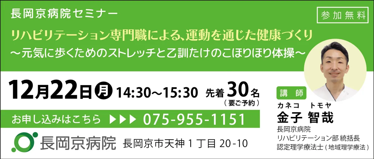 12月22日、京都府長岡京市の長岡京病院にて、運動に関連するセミナーが開催されます。このセミナーはリハビリテーション専門職が担当し、元気に歩くためのストレッチや「乙訓たけのこほりほり体操」をテーマにしています。運動に関心がある方や、健康維持に取り組みたい高齢者の皆さんにとって、見逃せないイベントとなるでしょう。