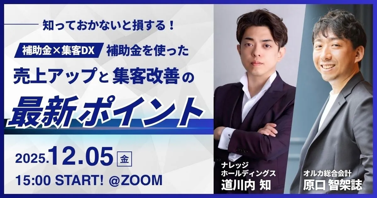 株式会社オルカの原口智架誌氏と株式会社ナレッジホールディングスの道川内知氏が共催するウェビナーが、2025年12月5日(金)15:00から行われます。本ウェビナーは、中小企業や個人事業主を対象に、「補助金を活用した売上アップ戦略」と「デジタルを駆使した集客改善」をテーマにしています。これからの時代に必要な知識を提供し、実務に役立つ具体的なノウハウを学ぶ絶好の機会です。