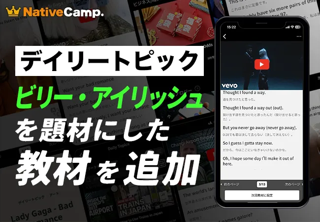 株式会社ネイティブキャンプは、あります。2025年11月29日(土)に、世界の動画を活用した人気教材「デイリートピック」に、ビリー・アイリッシュとカリードのヒット曲「lovely」に特化した新教材を追加しました。この教材は、英語を学ぶ多くの人々に新たな感情表現を学ぶ絶好の機会となっています。