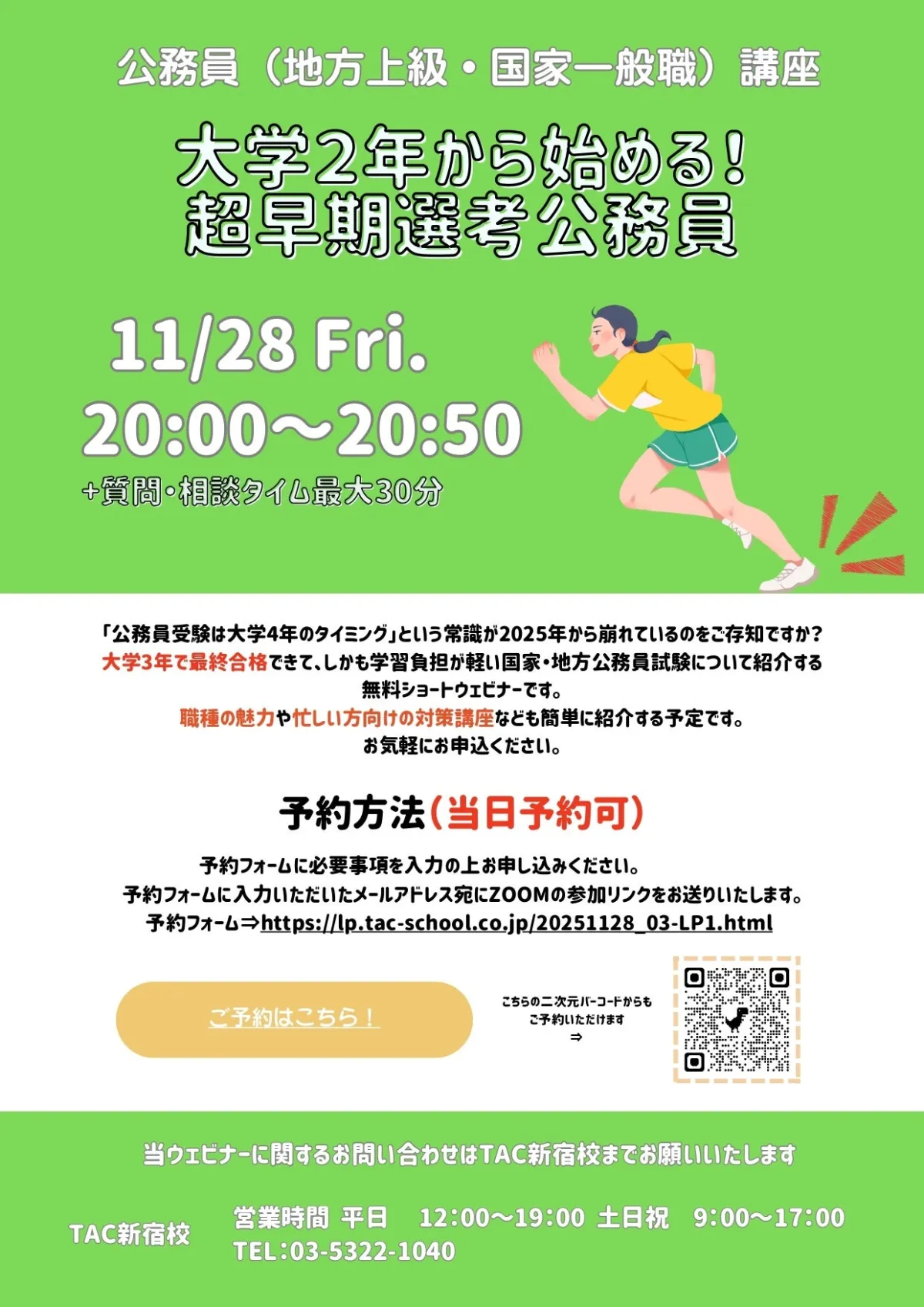 2025年11月28日(金)、TAC公務員が主催するオンラインセミナー「大学2年から始める!“超”早期選考公務員」が開催されます。このセミナーは、これから公務員を目指す学生に向けて、最新の選考情報や勉強方法を提供する内容となっています。