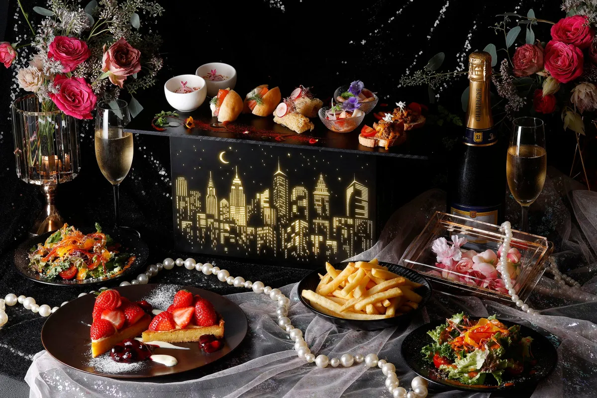 『NYブロードウェイ・ハイティー』では、ブロードウェイのネオンを模した色とりどりのセイボリーが、マンハッタンの美しい夜景を描いた華やかなスタンドに盛り付けられています。特製サンドイッチとして、チョップドチーズやサーモンのベーグルサンド、さらに揚げ春巻きと豊かなサラダが提供され、トリュフ風味のポテトも用意。これらそろったセイボリーは、見た目にも楽しませてくれる一品となっています。