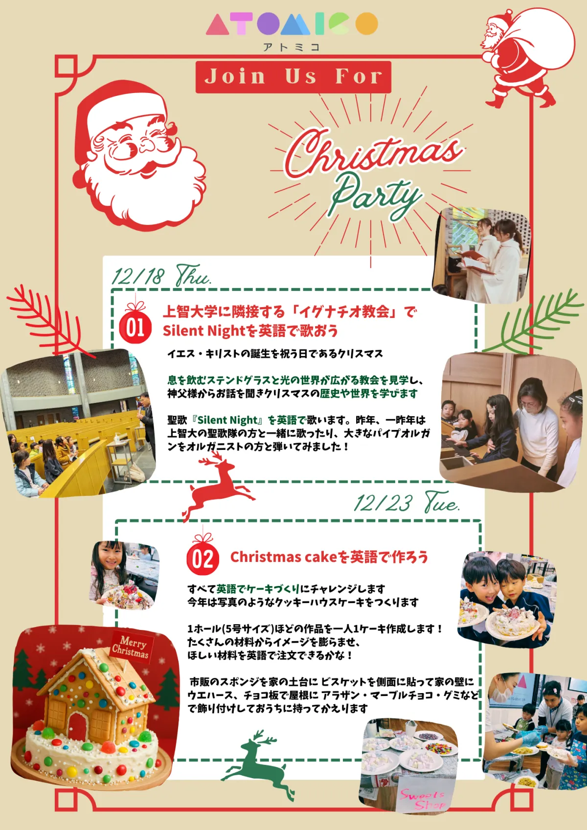 楽しいクリスマスの想い出を作るため、この機会にぜひ『atomico』のイベントにご参加ください。子どもたちが英語を学びながら心温まるクリスマスを迎えられることを、私たち一同心より楽しみにしております。詳しくは、公式サイトやインスタグラムで情報をチェックしてください!