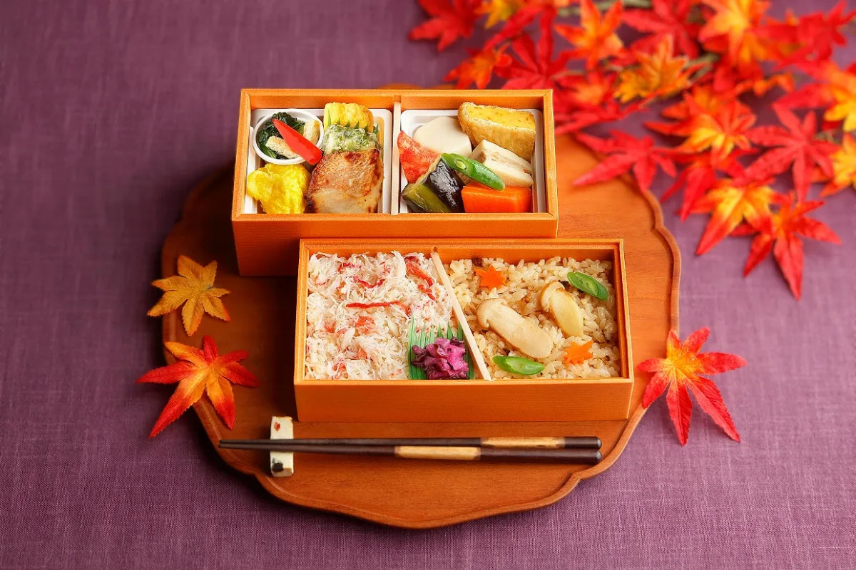 神田明神下みやびの「秋遊弁当」(1,296円)。焼鮭や銀杏、きのこなど、秋の味覚が存分に盛り込まれた一品です。さらに、