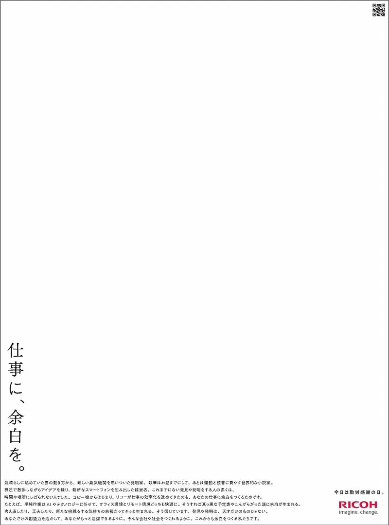 FMX(株式会社FIELD MANAGEMENT EXPAND)は、リコーが2024年の勤労感謝の日に掲載した新聞広告『仕事に、余白を。』が第74回日経広告賞で優秀賞を受賞したことを発表しました。この受賞は、FMXにとって3年連続、そして通算3度目の栄誉となります。