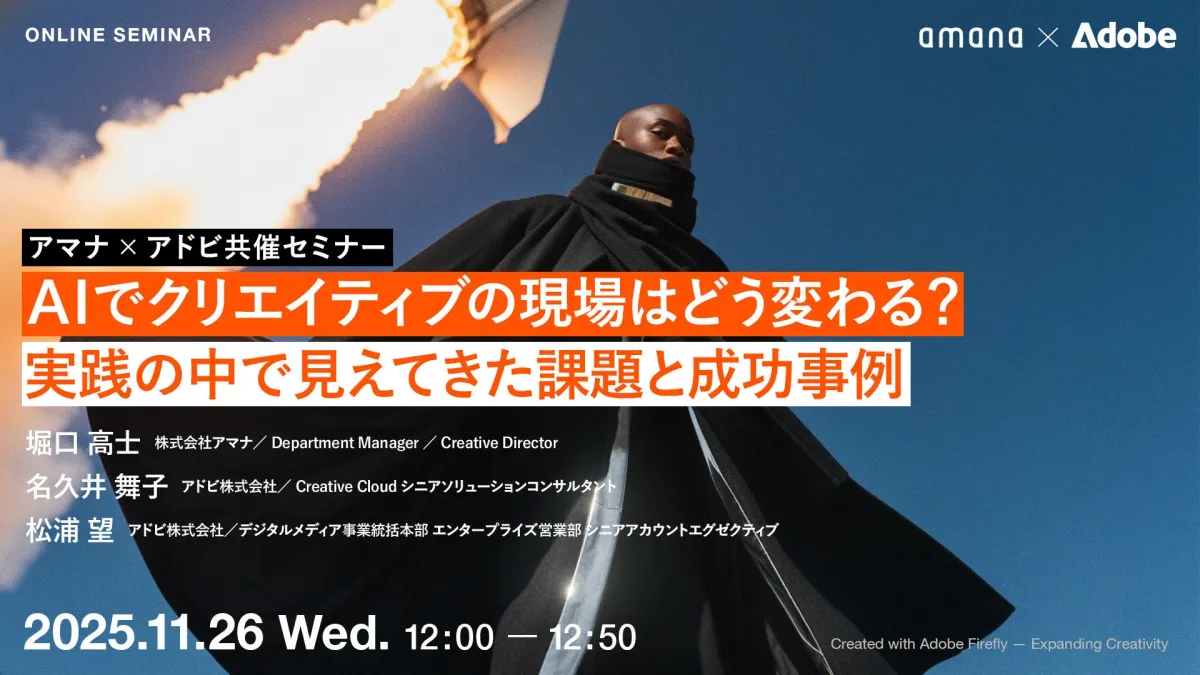 2025年11月26日(水)に、株式会社アマナとアドビ株式会社が共催するオンラインセミナーが開催されます。テーマは「AIでクリエイティブの現場はどう変わる?実践の中で見えてきた課題と成功事例」。このウェビナーは、変革を追求する企業のAI活用担当者にとって、明日から実践できる具体的な示唆を提供します。