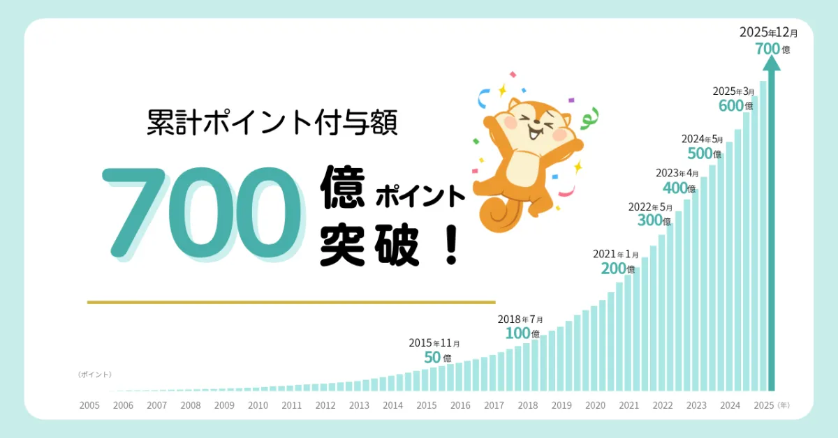 ポイントサイト「モッピー」が、2025年12月4日付けで累計ポイント付与額が700億ポイントを超えたことを発表しました。株式会社セレスが運営する「モッピー」は、国内で最も多く利用されるポイントサイトとして、1,300万人以上の会員を誇ります。