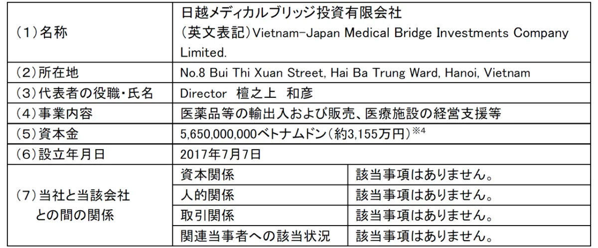 今回の資本参加による業績への影響は今期においては軽微ですが、中長期的には企業価値を向上させるものと期待しています。私たちの新たな挑戦が、ベトナムの医療市場に新しい価値を提供することを信じています。