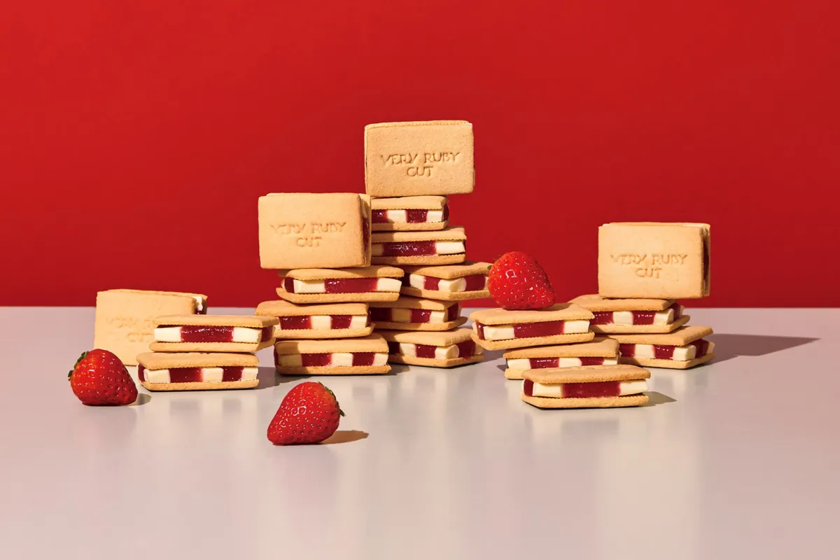 まずは、[[ベリールビーカット]]の「いちごミルクサンド」。これは苺スイーツ専門店が手掛けたもので、イタリア産のサブリナ苺を使用しています。この苺をとろりと煮詰めたコンフィチュールと、クリーミーな練乳ミルクで仕上げたホワイトショコラが見事に組み合わさります。その結果、しっとりとしたクッキーでサンドされた、まさに“とろける”口どけを楽しむことができます。