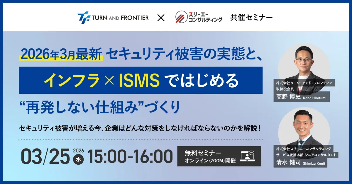 年々悪化するサイバーセキュリティの脅威。特にランサムウェア攻撃の増加は企業にとって深刻な問題となっています。サイバー攻撃の手法が今も巧妙化するなか、企業はただ防ぐだけではなく、被害を最小限に抑えるための取り組みが求められています。そんな状況の中、株式会社ターン・アンド・フロンティアと株式会社スリーエーコンサルティングが共催するオンラインセミナーが3月25日(水)15:00から開催されます。