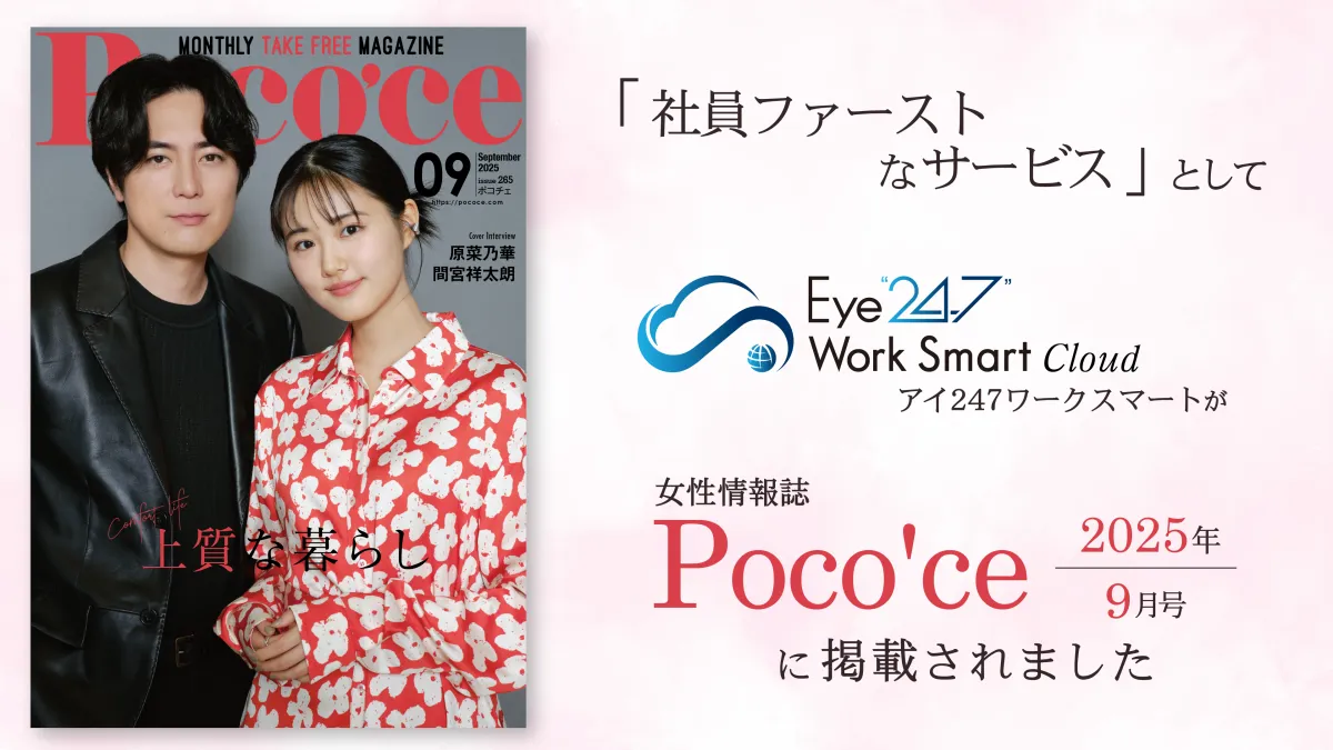 『Poco’ce(ポコチェ)』の9月号では、働く女性たちが望む「社員ファーストなサービス」として『Eye“247” Work Smart Cloud』が特集されました。この号では、同社のリニューアルオフィスで育休明けの社員へのインタビューも行われ、実際の働く環境についての情報も多く掲載されています。
