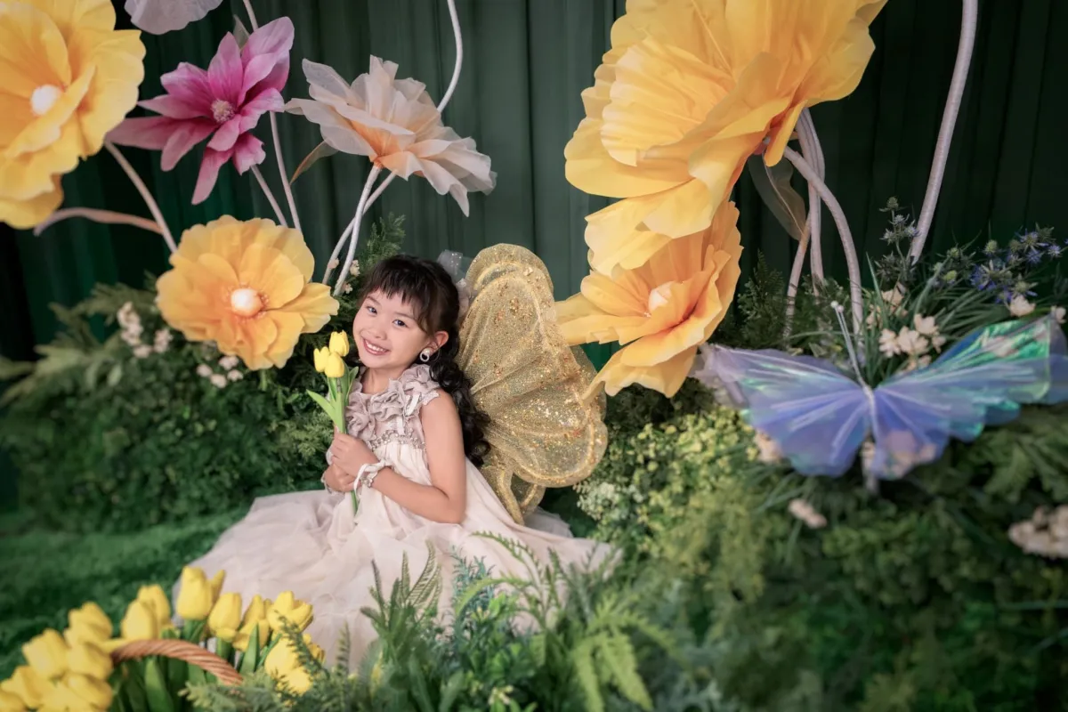 このセットでは、まるで不思議な花の世界に迷い込んだような体験ができます。大きな花々に囲まれて、フェアリーになりきる娘の姿は、他の場所では得られない魅力的な写真を生み出します。