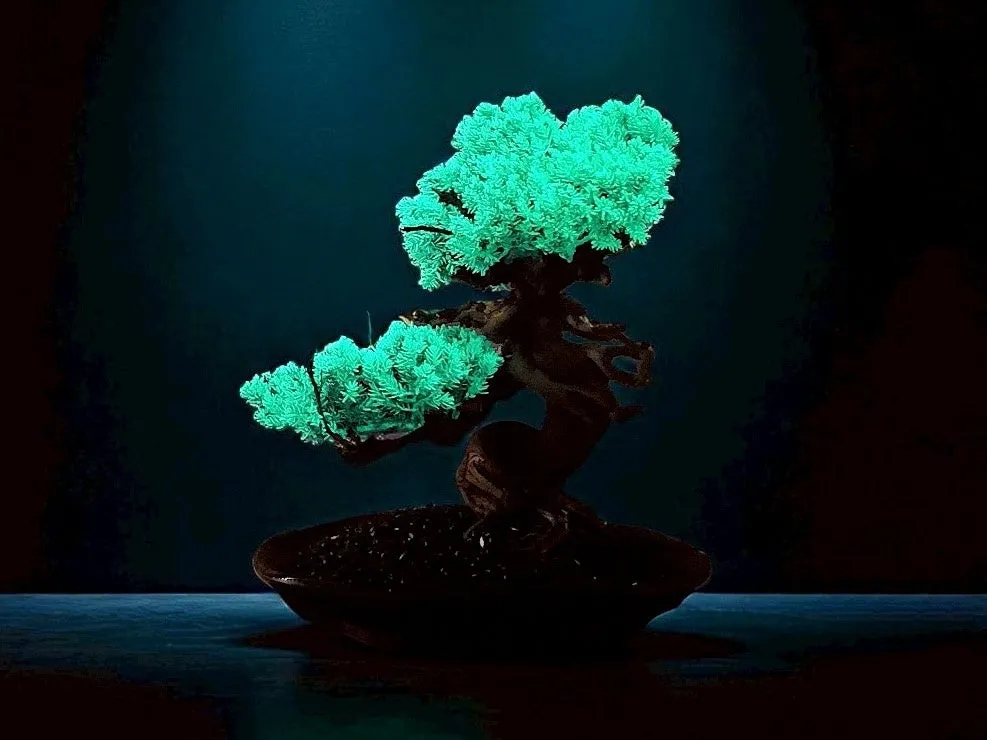 「HIKARI盆栽」は、本来なら枯れた盆栽を再生させ、特別な塗料を使って光を宿す独自の技術を採用しています。この盆栽は、漆黒の空間に静かに浮かび上がり、その美しい光は、見ている人に深い安らぎを与えます。盆栽の枝や葉が蓄えた光が夜になると優しげに輝き、まるで盆栽が命を持っているかのように感じられます。古来から盆栽が「小宇宙」と称される所以は、まさにこの光の中に表現されています。