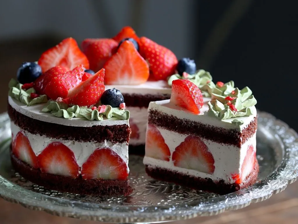 ケーキはグルテンフリーのココアスポンジ、オリジナルの豆乳ホイップクリームがベースとなり、抹茶風味のクリームで彩られています。華やかなデザインは、クリスマスの雰囲気にぴったりで、特別な日を一層華やかに演出するでしょう。