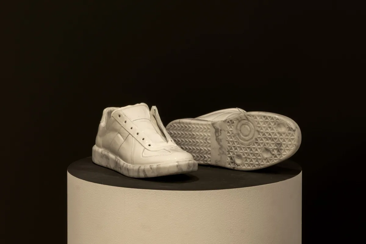 展示会場では、村松が手掛けた、シューズ「Replica」のソールを大理石化した作品も展示されています。彼の特異なアートスタイルを体験する絶好の機会となるでしょう。