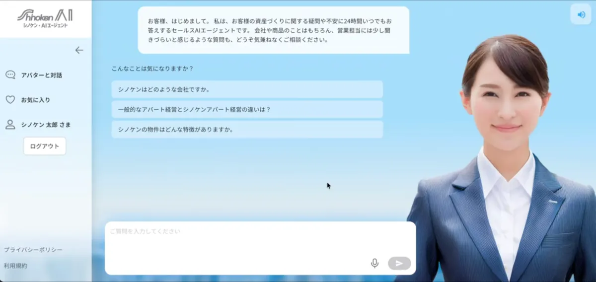 このAIエージェントは、SapeetとPKSHAの生成AI技術を基に、エクストーンのUI/UXデザイン力を合わせて構築された対話型AIアバターです。シノケングループのWebサイト上で常時稼働し、顧客が会社概要や投資商品の説明、さらには不動産投資に関する質問を行うことができます。以下に、サービスの特長を紹介します。
