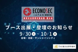 2025年9月30日から10月1日まで、池袋のサンシャインシティにて、国内唯一の経済安全保障に特化したカンファレンス「経済安全保障対策会議・展示会(ECONOSEC JAPAN 2025)」が開催されます。このイベントは、経済安全保障に関する情報発信と意識啓発を目指しており、今年もTMI総合法律事務所が出展します。