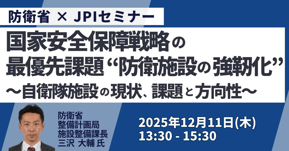 2025年12月11日(木)に、国家安全保障戦略の重要課題として注目される「防衛施設の強靭化」に関するセミナーが開催されます。実施機関は、日本計画研究所(JPI)で、防衛省整備計画局の施設整備課長、三沢大輔氏を講師に招いて、現状分析や今後の方針について詳しく説明していただきます。参加者はこの機会を通じて、自衛隊の施設整備の背景や意義を理解し、重要な知識を得ることができます。