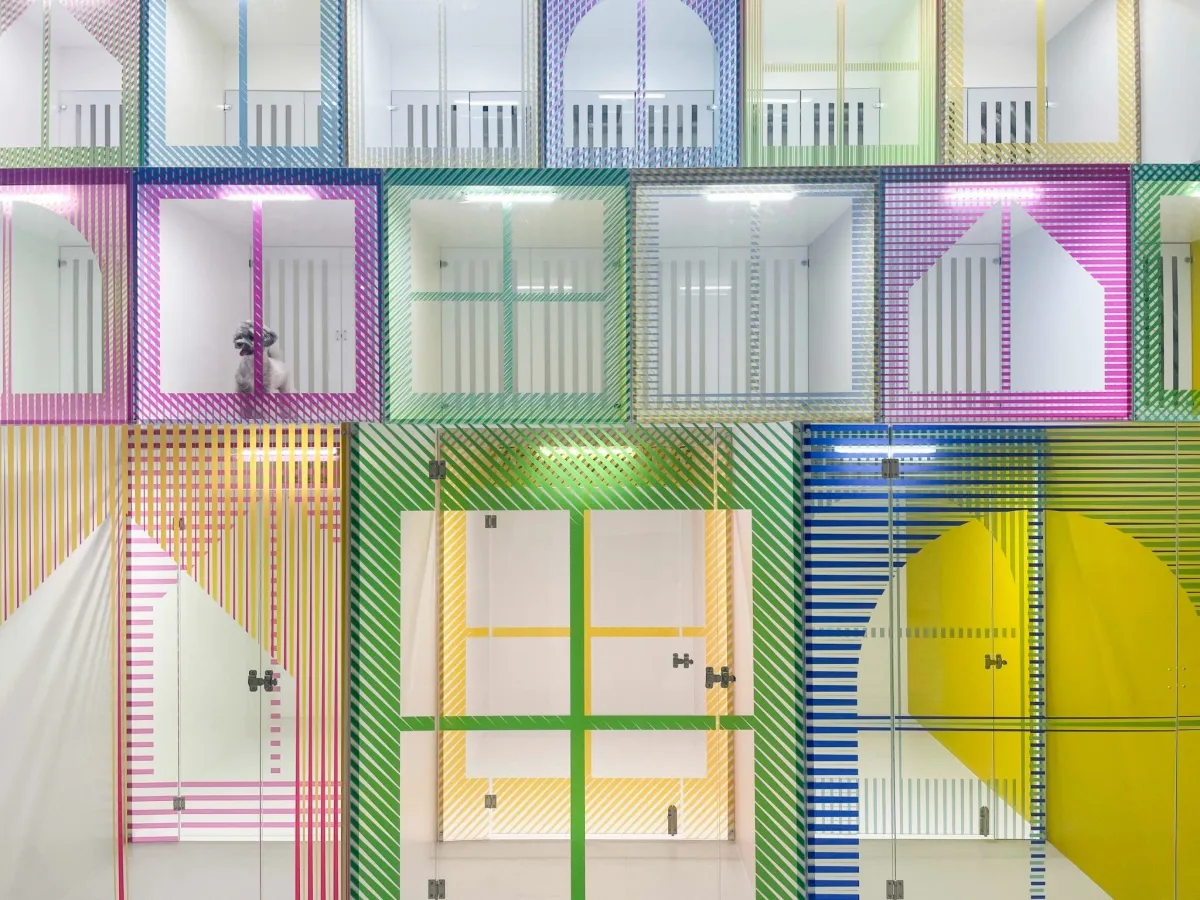 施設は、開放感のある約3mの高さの天井を持ち、全18室のカラー豊かなペットホテルと清潔感あふれるトリミングサロンで構成されています。この空間は、まるで小さな「わんちゃんの世界」に迷い込んだかのような特別感を提供します。