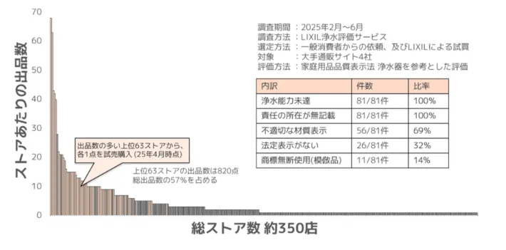 最近、特に注目を集めているのは、模倣品や互換品の急増です。LIXILが実施した調査によると、通販サイトで流通している互換品のうちすべてが浄水能力の基準をクリアしておらず、その中には無断で商標を使用している悪質な製品も含まれていました。これらの製品の使用は、知らず知らずのうちに健康リスクを高めてしまう可能性があります。