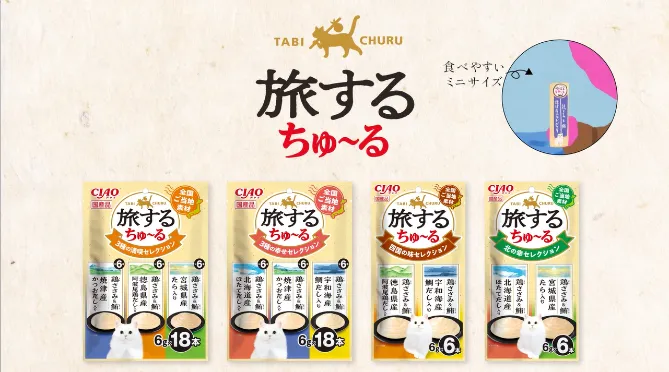 「CIAO旅するちゅ~る」は、猫ちゃんに全国各地のおいしいものを届けるというコンセプトで開発された人気シリーズです。これまでのちゅ~るに新たなフレーバーを加えた商品ラインナップがあり、猫ちゃんの嗜好に合うように工夫されています。