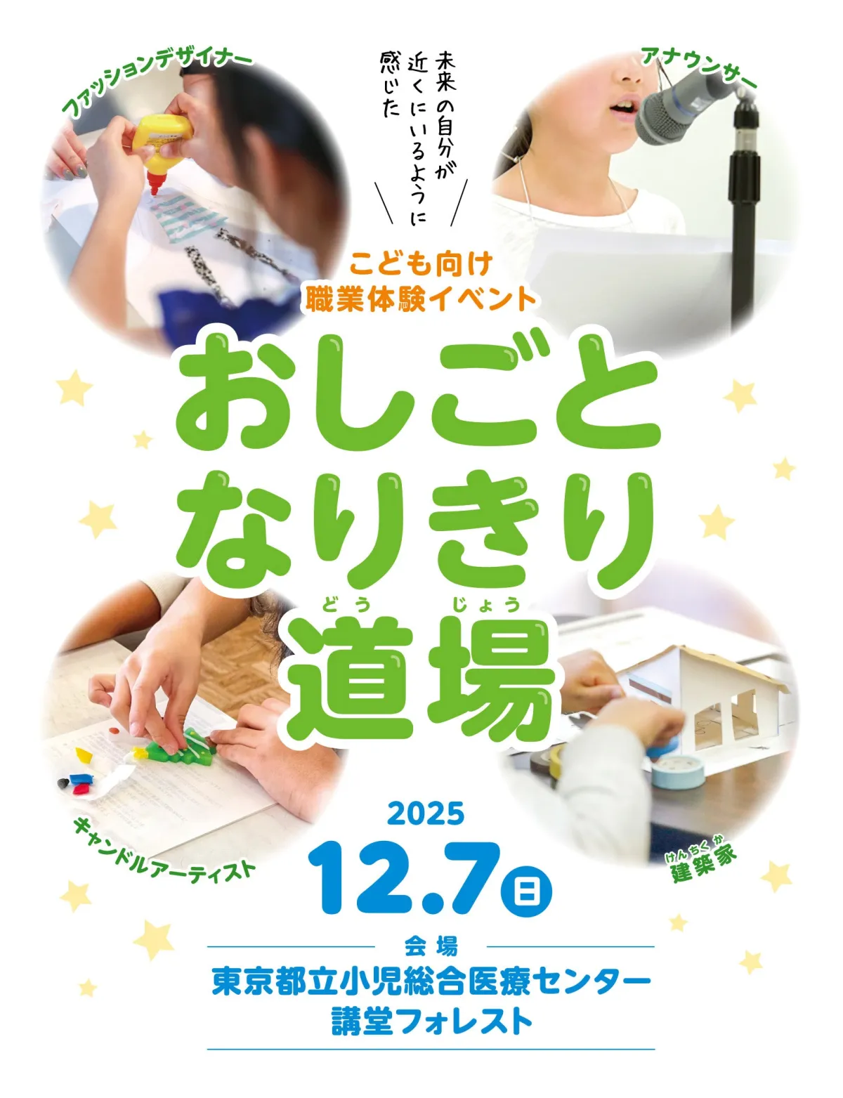 一般社団法人夢らくざプロジェクトが、2025年12月7日(日)に東京都立小児総合医療センターで療養中の子どもたちを対象とした職業体験イベント「おしごとなりきり道場」を初めて開催します。このイベントは、長期入院や通院のために学校生活や社会と切り離されがちなこどもたちに、「学びの機会」「社会とのつながり」「未来への希望」を届けることを目的にしています。