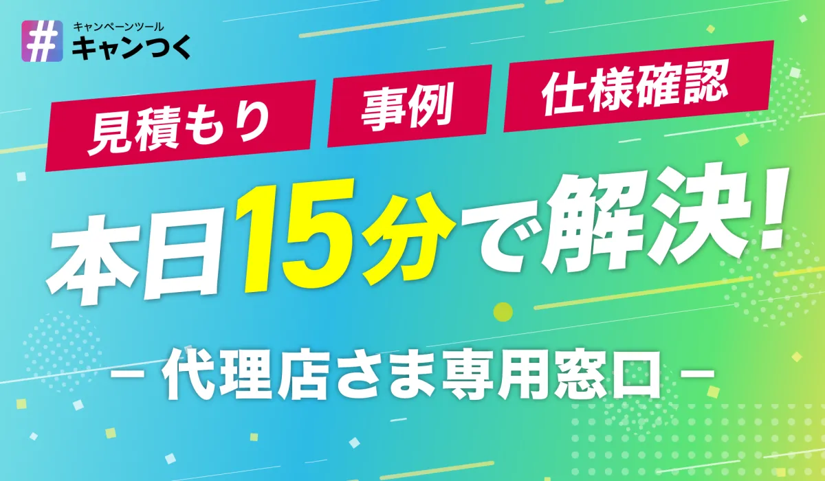 『キャンつく』は、SNSやイベント会場でのキャンペーンを迅速かつ低コストで実施できるキャンペーン管理ツールです。このツールは、企業が「SNSのフォロワーが増えない」「兼務でSNS施策に注力できない」「人的リソースが不足している」といった課題を抱える際に、効果的な解決策を提供します。導入が簡単でありながら機能も充実しているため、多くの企業から高い評価を得ており、手厚いサポート体制も用意されています。運用開始後もスムーズなサポートが受けられるので安心です。