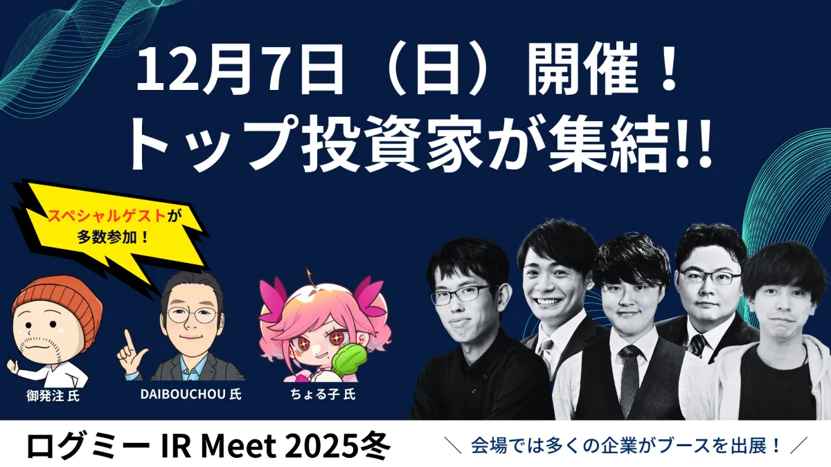2025年12月7日(日)、渋谷ストリームホールにて、投資家必見のイベント「ログミー IR Meet 2025冬」が開催されます。このイベントは、ログミー株式会社が運営するIRメディア「ログミーFinance」によって実現され、経験豊富な投資家たちが集結します。特に注目したいのは、ゲストスピーカーとして招かれるトップ投資家たちです。御発注氏、DAIBOUCHOU氏、ちょる子氏といった有名な投資家が一堂に会し、彼らの貴重な投資の視点や手法を直接学ぶ絶好のチャンスです。