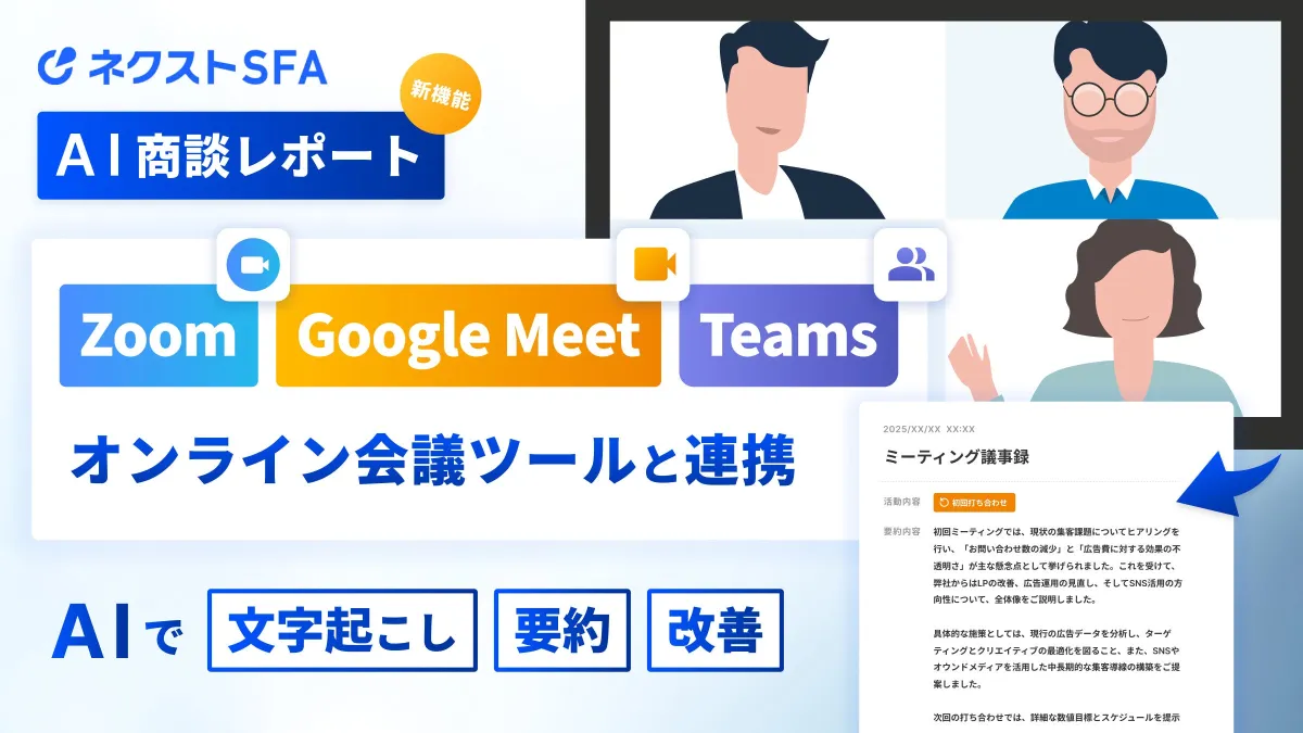 株式会社ジオコードが提供するクラウド営業支援ツール「ネクストSFA」は 新たに「AI商談レポート機能」において、Google MeetやZoomとの連携が可能となりました。この進化は営業担当者にとって、大きな時短と業務効率化を実現するものです。
