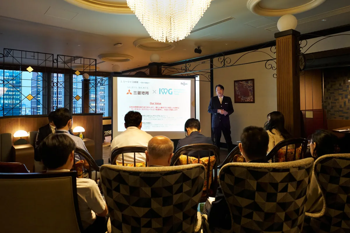 続いて、リージャスのCEOである西岡真吾が成長戦略を発表しました。西岡は、国内におけるフレキシブルオフィスのリーディングカンパニーとして、さらなる市場活性化を目指すとともに、利用目的に応じた多彩なサービスを展開することの重要性を強調しました。また、三菱地所グループの信頼性と IWGグループのグローバルなネットワークを強みとし、幅広い顧客ニーズに対応できる体制を整えていることも述べました。