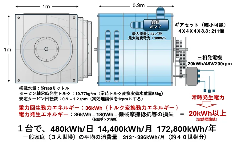 重力リアクターは、1立方メートルのサイズのコンパクトな箱に収められ、常時20kWh以上の電力を半永久的に供給することができます。この発電力は、一般家庭の月間消費電力350kWhに対して、約40世帯分の電力を賄うことが可能です。