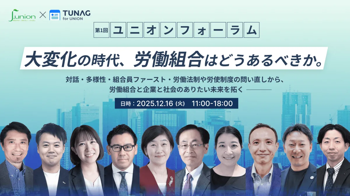 2025年12月16日(火)、労働組合の未来を見つめる中で、「第1回ユニオンフォーラム(j.union × TUNAG for UNION)」が開催されます。このフォーラムは、株式会社スタメンが提供する「TUNAG for UNION」と、労働組合の専門コンサルティング会社であるj.unionが共に開催するものです。これは、労働組合が直面している今の大きな転換期における重要なイベントとなるでしょう。