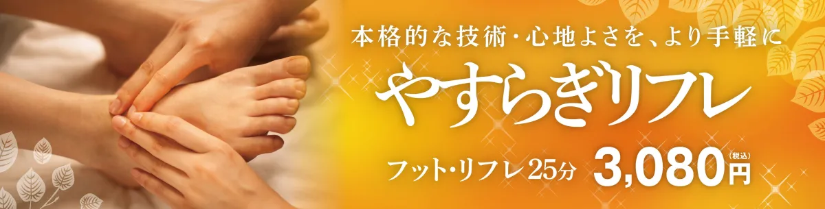 『やすらぎリフレ』は、フット・リフレクソロジーの一種で、施術時間は短縮された25分。受けるのは20分間の実施です。料金は税込3,080円と手ごろで、時間がない方でも気軽にリフレッシュしたい時にぴったりです。このメニューは、通常のリフレクソロジーよりも施術の強さを抑えたアプローチを採用しており、痛みを感じることなく、安らぎを体感することができます。