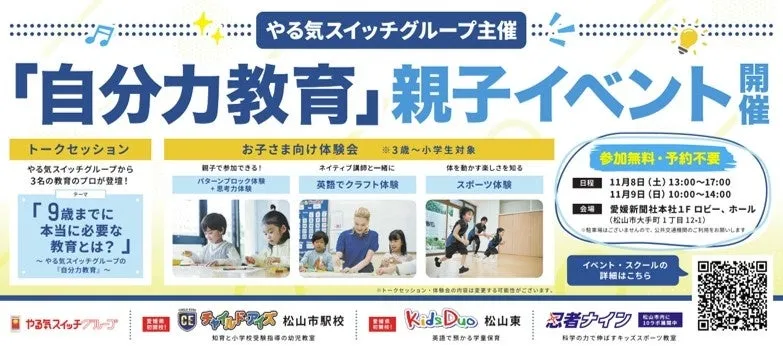 愛媛新聞社で2日間にわたり、親子向けの無料教育イベントが開催されます。このイベントは、株式会社やる気スイッチグループが愛媛県における英語での学童保育「Kids Duo®」と知育・受験対策「チャイルド・アイズ®」の初開校を記念して行われるもので、9歳までに本当に必要とされる教育に焦点を当てています。