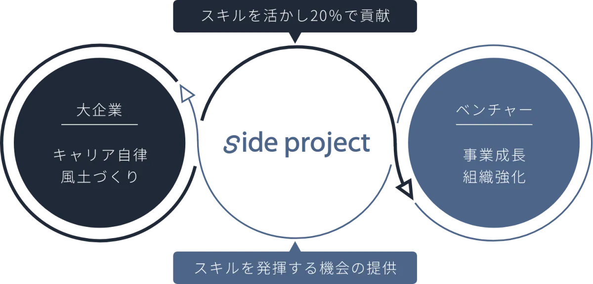 「side project」は、企業に属する人材が異なる環境の中で経験を積むことを狙ったプログラムです。大企業の職員がスタートアップに取り組むことによって、自身のスキルや知識が豊かになるだけでなく、スタートアップの力を借りてさらなる成長を目指します。このプログラムを通じて、多様性が組織内で活かされ、イノベーションが促進されることが目指されています。