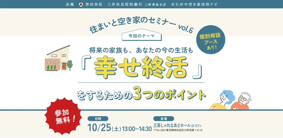世田谷区が主催し、三井住友信託銀行との共催で行われるこのセミナーでは、空き家の問題を専門とする講師と資産管理のプロ、財務コンサルタントが登壇します。