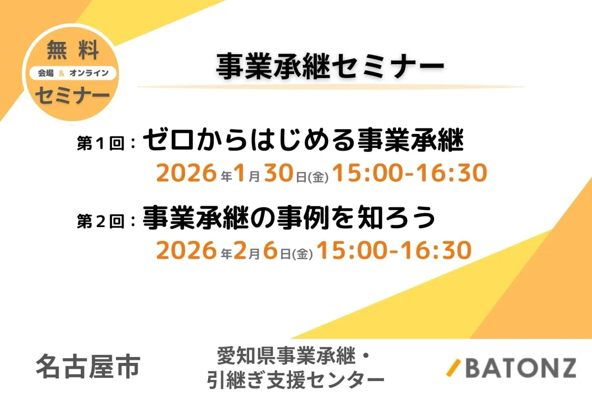 事業承継は中小企業にとって避けては通れない重要なテーマです。株式会社バトンズが名古屋市および愛知県事業承継・引継ぎ支援センターと連携し、2026年1月30日と2月6日に「事業承継セミナー」を開催します。このセミナーでは、経営者や後継者候補を対象に、円滑な事業承継のための基本知識や実際の成功事例を学んでいただけます。