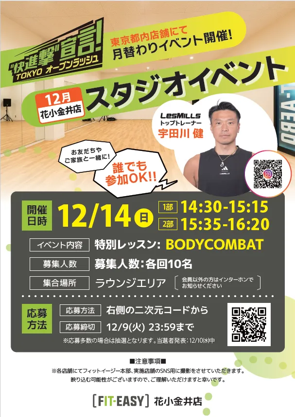 東京都心でのフィットネスシーンをリードするフィットイージー株式会社が、12月14日(日)に特別イベントを開催します。このイベントでは、ニュージーランド発の人気フィットネスプログラム「BODYCOMBAT」を、Les Millsのトップトレーナーである宇田川健氏が指導します。開催場所は、FIT-EASY花小金井店。今回はこの特別レッスンについて詳しくご紹介しましょう。