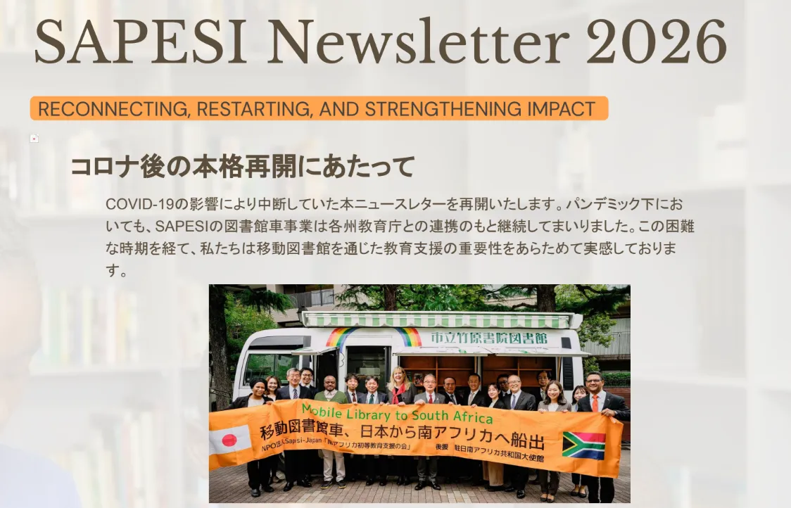 特定非営利活動法人SAPESI-Japan(東京都港区、理事長:池澤憲一)は、南アフリカ共和国における教育格差解消のための移動図書館支援に新たなステップを踏み出しました。2026年度の計画を発表した「SAPESI Newsletter 2026」は、COVID-19による影響を乗り越え、移動図書館の重要性を再確認した内容をまとめています。特に、南アフリカの初等教育において、識字力向上を目指した取り組みが強調されています。