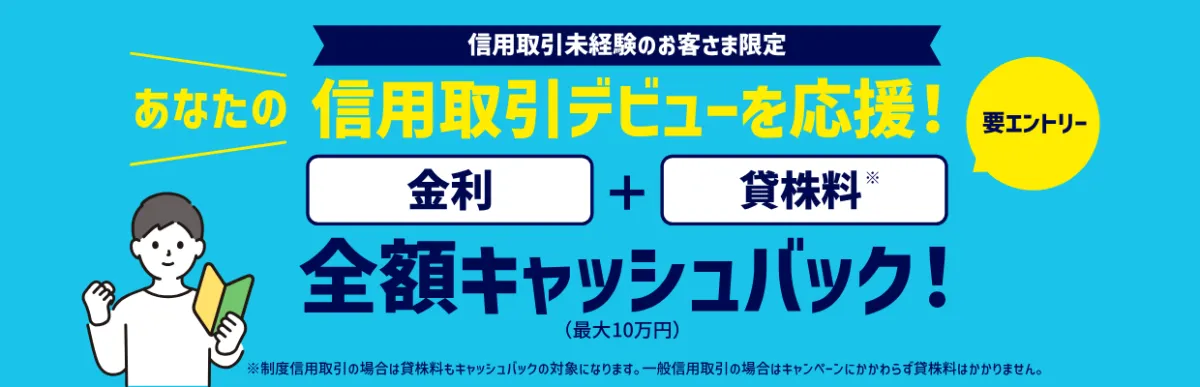 このキャンペーンでは、信用取引未経験者を対象に特別なオファーが用意されています。新たに信用取引口座を開設した場合、取得した株式や購入にかかる金利を全額キャッシュバックします。これは新たな投資の第一歩を踏み出す方々への大きなサポートです。このキャンペーンは、信用取引口座があるものの過去にトレードを行ったことがない方にも適用されます。
