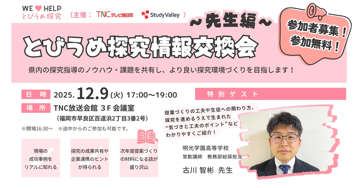 福岡市のTNC放送会館にて、2025年12月9日(火)に「とびうめ探究情報交換会~先生編~」が開催されます。このイベントは、福岡県内の教員を対象としたものです。参加者は探究指導に関する成功事例や課題を共有し、最新の教育トレンドを学ぶことができます。この機会を活用して、より良い探究学習環境についての理解を深めましょう。