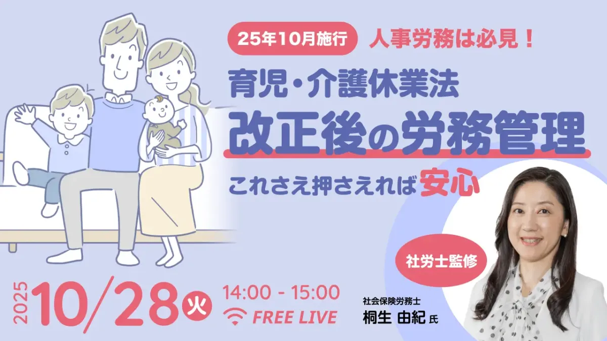2025年10月1日より施行される改正育児・介護休業法に伴い、企業の人事・労務担当者が抱える課題解決のためのウェビナーを開催します。このイベントでは、どのように法改正に対処すれば良いのかを具体的に学ぶことができます。主催はjinjer株式会社で、Authense社会保険労務士法人の代表・桐生由紀氏が登壇します。