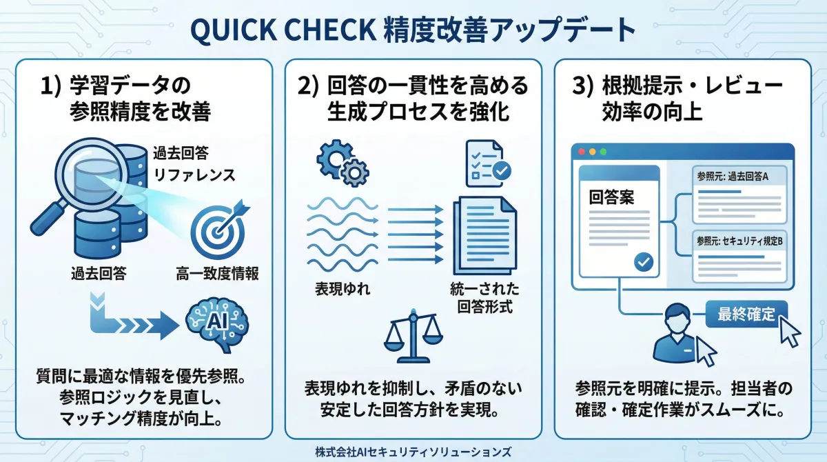 最近、企業において重要な役割を果たすセキュリティチェックシートが、AIによって大きく進化しています。株式会社AIセキュリティソリューションズが提供する『QUICK CHECK』は、セキュリティチェックシートの自動回答を実現するツールとして注目されています。この度、回答精度を劇的に改善するためのアップデートが発表され、業務効率化にさらに寄与することが期待されています。