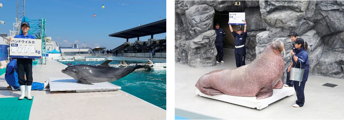 これらの生き物たちは、特にハンドサインに従って自ら体重計に乗るバンドウイルカや、カゴに入れて計測されるフンボルトペンギンの様子など、普段見ることのできない光景を間近で観察できます。