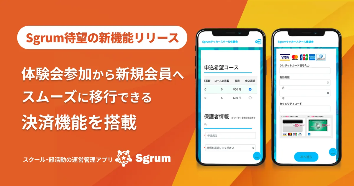スポーツテック企業の株式会社ユーフォリアが開発した運営管理アプリ『Sgrum(スグラム)』が新たに、イベントや体験会の申し込み管理機能にクレジットカード決済機能を追加しました。この新機能の導入により、スクールの受講者だけでなく、非会員の参加者からもオンラインで参加費を徴収することが可能になります。これにより、現金管理の手間や未払いリスクを解消し、スクール運営のデジタル化を推進します。