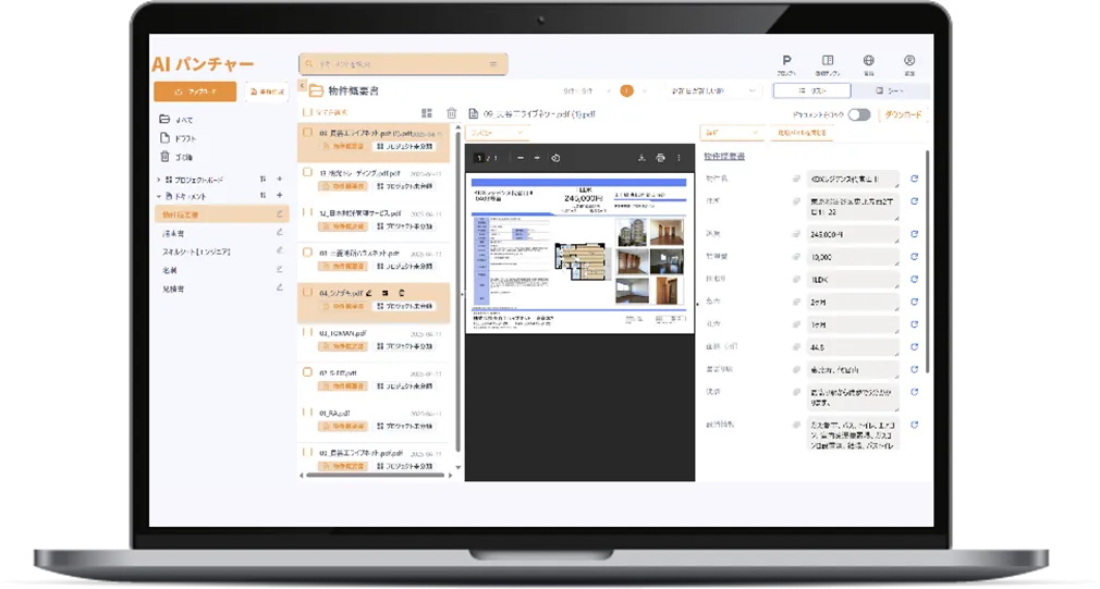 AIパンチャーの特筆すべき点は、全文解析が可能な高精度OCR機能を搭載していることです。これにより、定型外の書類でもデータ化することができ、設定はシンプルに1画面で済むため、特別なエンジニアリング知識は不要です。たとえば、名刺から顧客管理システム用のデータを作成することや、契約書の自動生成、営業メモを基にした提案書の作成などが可能となります。