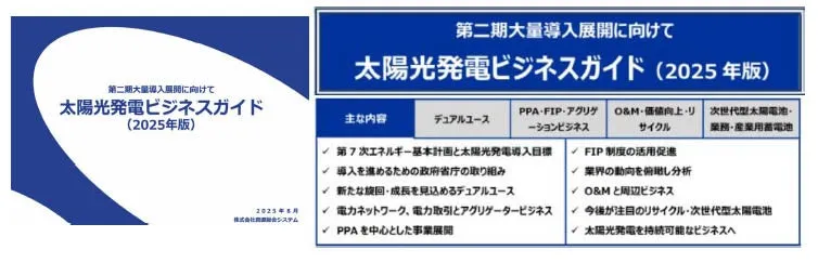 株式会社資源総合システムが2025年8月6日に発行した「太陽光発電ビジネスガイド2025 ~第二期大量導入展開に向けて~」についてご紹介します。これは、急速に変化するエネルギー市場において、太陽光発電の現状や今後の展望を明確にするための重要な資料です。