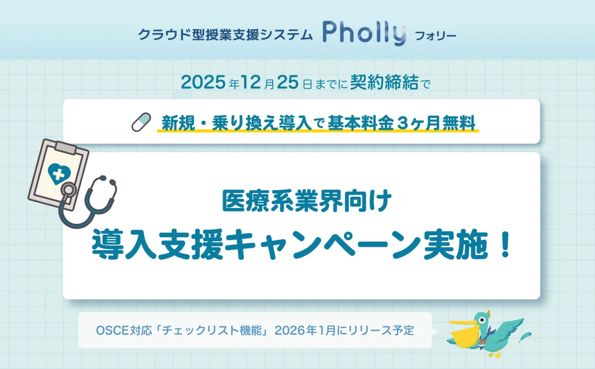 対象となるのは、看護・医学・作業療法などの医療系学校です。契約を2025年12月25日までに締結すると、利用開始から3ヶ月間、月額料金が無料となります。これにより、初期コストを抑えながら、スムーズなシステム導入が可能になります。特に、実技試験や評価に特化した機能を持つPhollyは、教育現場のニーズに応えるために開発されています。